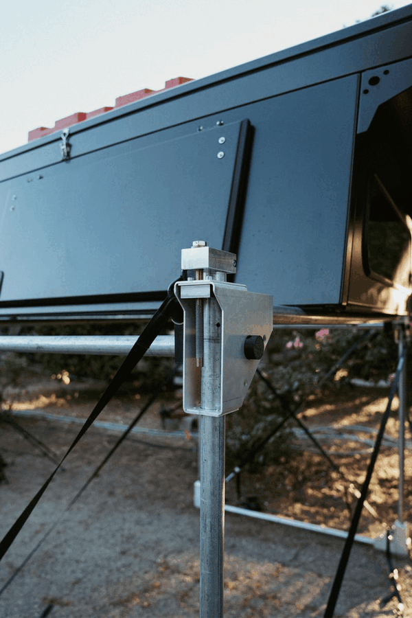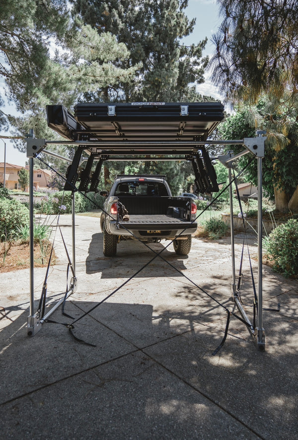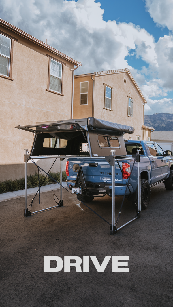 CAPABLE OF HOLDING UP TO 400LBS, OUR PATENT PENDING RAPID STAND™ OFFERS A STRONG, FAST, AND MOBILE OPTION TO TAKE YOUR TOPPER OR BED RACK OFF. WHEN DISMANTLED, THEY CAN SLIDE INTO A CANVAS BAG TO STORE IN YOUR GARAGE, SMALL CLOSET, OR UNDER YOUR BED.